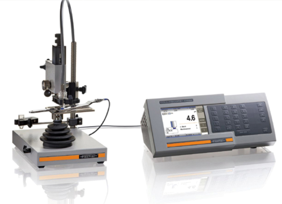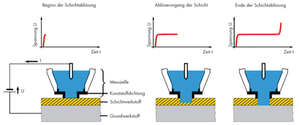 Bei dem nach dem coulometrischen Prinzip (gemäß DIN EN ISO 2177) arbeitenden Couloscope CMS2 (Abb. 1 aus [2]) wird die eigentliche Messzelle mit Dichtung auf die Messfläche aufgesetzte und damit definiert. Die verwendeten Elektrolyte sind auf die verschiedenen Schichtwerkstoffe abgestimmt; ein Ablösen erfolgt erst bei Stromfluss. Abbildung 2 zeigt die Funktion und die erhaltene Messkurve des Verfahrens.