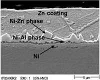 Zinkschicht auf vernickeltem (<0,1 µm) Stahl, wobei sich intermetallische Phasen in der Übergangszone bilden / Bildquelle: M. Blumenau