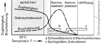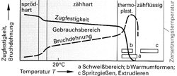 Die amorphen Thermoplaste bestehen aus regellos ineinander verschlauften und verknäuelten Makromolekülen ohne regelmäßige Anordnung und Orientierung. Es fehlt jede Art von Fernordnung, das heißt eine über den nächsten Nachbarn hinausgehende Ordnung der Makromoleküle bezüglich Abstand, Anordnung und Orientierung. Der Zusammenhalt zwischen den Molekülketten erfolgt durch mechanische Verschlaufungen und Verhakungen sowie durch sekundäre chemische Bindungskräfte (Nebenvalenzbindungen). Ihre Festigkeit erhalten diese Kunststoffe aus den Reibungskräften und der Verschlingung der Makromoleküle. Bei Raumtemperatur sind die Thermoplaste hart. Mit zunehmender Temperatur werden sie elastisch und bei weiterer Erwärmung plastisch weich und schließlich flüssig. Bei Abkühlung der heißen Kunststoffmasse verändern sie sich vom flüssigen, über den plastisch weichen und elastischen Zustand zum harten Material. Dies verleiht ihnen die Eigenschaft der Warmumformbarkeit und Schweißbarkeit. Da diese Kunststoffe beim Erwärmen weich werden, nennt man sie Thermoplaste (von griechisch thermo = Wärme). Die Erwärmung von Kunststoffen ist nur bis zu einer bestimmten Grenztemperatur (Zersetzungstemperatur) möglich, da sie sich bei Überschreiten dieser Temperatur zersetzen.