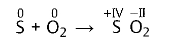 Die Oxidationszahl des Schwefelatoms nimmt von Null auf +IV zu, der Schwefel wird oxidiert. Die Oxidationszahl der Sauerstoffatome nimmt von Null auf –II ab, Sauerstoff wird reduziert.