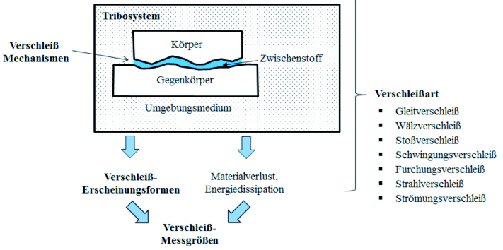 In der 1997 zurückgezogenen DIN 50320 wird Verschleiß als der fortschreitende Materialverlust aus der Oberfläche eines festen Körpers (Grundkörper), hervorgerufen durch mechanische Ursachen, d. h. Kontakt- und Relativbewegung eines festen, flüssigen oder gasförmigen Gegenkörpers, also den Masseverlust (Oberflächenabtrag) einer Stoffoberfläche durch schleifende, rollende, schlagende, kratzende, chemische und thermische Beanspruchung bezeichnet. Im Arbeitsblatt 7 der Gesellschaft für Tribologie [1] werden innerhalb des Tribosystems (Abb. 1) folgende Größen für die Betrachtung des Themas Verschleiß definiert: Verschleißmechanismen, Verschleißarten, Verschleißerscheinungsformen und Verschleißmessgrößen. Allgemeinsprachlich wird der Begriff Verschleiß für den Vorgang des Verschleißens sowie das Ergebnis verwendet. Zur Unterscheidung können für den Vorgang der Begriff Verschleißvorgang und das Ergebnis die Begriffe Verschleißerscheinungsformen und/oder die Verschleißmessgrößen verwendet werden [1].
