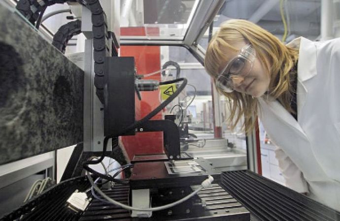 Die Jenaer Chemikerin Anke Teichler überwacht die Herstellung von Komponenten einer neuartigen Batterie auf Polymerbasis durch ein spezielles Printverfahren, wie sie auch am CEEC erforscht werden Foto: Jan-Peter Kasper/FSU