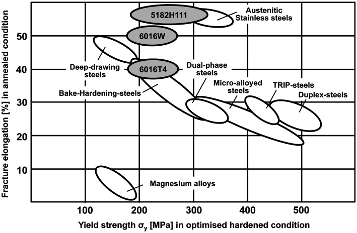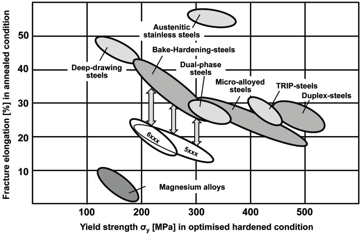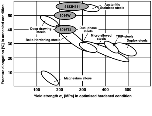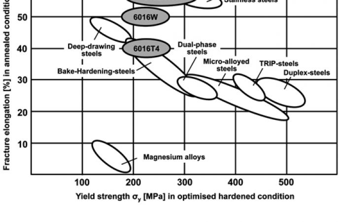 For a long time, aluminium wrought alloys have been used as the predominant material for the sheet metal processing industry. Aluminium alloys not only show a high affinity for passivation, which results in corrosion resistance in many environments [1], but also indicate high specific strengths (strength versus density) and rigidity (Young´s modulus versus density). A negative aspect is, however, that aluminium alloys have a very low formability when compared with modern steels. Figure 1 illustrates the fracture elongation versus yield strength of aluminium wrought alloys and deep-drawing steels in optimised hardened condition. Aluminium wrought alloys with the designation EN AW-5xxx and EN AW-6xxx show similar yield strength values compared with bake-hardening steels; although the fracture elongation differs by around 50 % in favour of the steels.