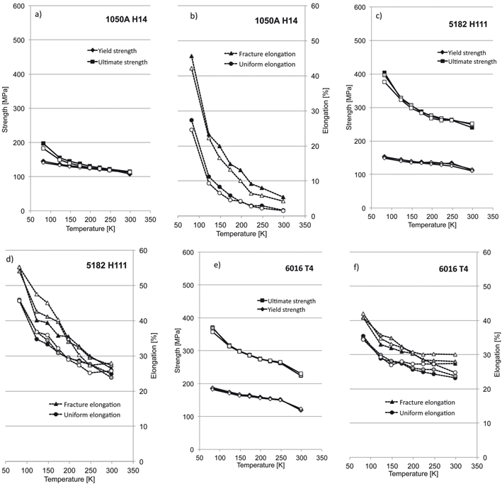 A similar trend can be observed for the aluminium alloy EN AW-6016 in both heat treatment conditions, where the elongation in T4 condition is less than in W30 condition. For a decrease in temperature the Aluminium alloy EN AW-1050A shows a rather shallow rise of the ultimate and yield strength over the whole temperature range; whereas curves of uniform and fracture percentage elongation of this alloy indicate significant increases in the magnitudes of their gradients. The influence of strain rates regarding strength values can be considered as small, as shown in Figure 8a, Figure 8c and Figure 8e. A slightly more distinct effect can be observed for the elongation values, especially for EN AW-5182 and EN AW-6016 T4. Nevertheless, those variations converge as the temperature approaches 77 K (Fig. 8b, Fig. 8d and Fig. 8f).