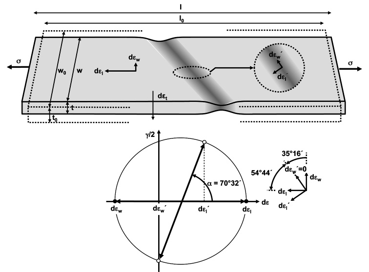 In this deformation state it can be observed that only localised necking occurs (A—B) and there is no reduction in width over the whole specimen length (B—B) which would be denoted as diffuse necking [6]. This is in contrast to most metallic materials, where localised through-thickness necking arises e.g. on aluminium alloy EN AW-5xxx in an annealed condition, but not over the whole length. As a consequence, a pattern of localised through-thickness striations can be observed oriented at around ± 55° to the direction of the principal normal stress (Fig. 2a) [2, 3]: these are also known as PLC bands. Figure 2b illustrates a formation of this localised affect, which is co-occurring with shear deformations in several planes. The condition of the volume of material where localised necking arises is that no strain be imposed on the non-deforming material adjacent to the flowing section which leads to dεw´= 0 as illustrated in Figure 3 [6]. The localising volume only deforms in thickness (dεt) and lengthways (dεl´), which characterises a biaxial strain state. Provided that there is an ideal plastic material behaviour and a negligible elastic fraction compared with the plastic fraction, Lévy-von Mises equations can be applied: