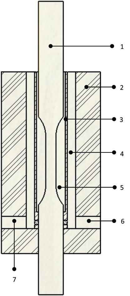Fig. 5: Cryogenic set-up: 1) Specimen, 2) Cryogenic dewar, 3) Medium-pipe, 4) Nitrogen filling, 5) Medium filling, 6) Gas inlet, 7) Air inlet