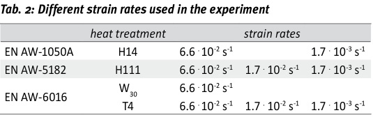 The uniaxial tensile tests were carried out with three different strain rates namely 6.6 · 10-2 s-1 (maximum velocity of the tensile testing machine), 1.7 · 10-2 s-1 and 1.7 · 10-3 s-1 (Tab. 2). The highest strain rate illustrated was an approach to the forming velocity used in industry.