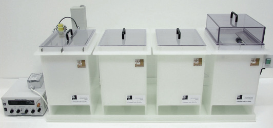 Das Einzelwannensystem TG mit einem Beckenvolumen von 5 L, 10 L, 20 L und 50 L ermöglicht das individuelle Zusammenstellen von Behandlungsbecken. Die Tischgalvanisierwannen können als Elektropolier-, Beiz-, Passivierungs- oder Spülwannen eingesetzt werden. Ergänzende Optionen, wie eine aufsteckbare Warenbewegung, Gleichrichter, Bodenheizkörper mit Temperaturregler und Trommeleinrichtungen ermöglichen eine optimale Oberflächenbehandlung. Die Behälter können ohne großen Aufwand in jedem entsprechend ausgestatteten Labor oder einer Werkstatt aufgestellt werden. Sie eignen sich zur Behandlung von Muster, Prototypen oder Kleinserien.
