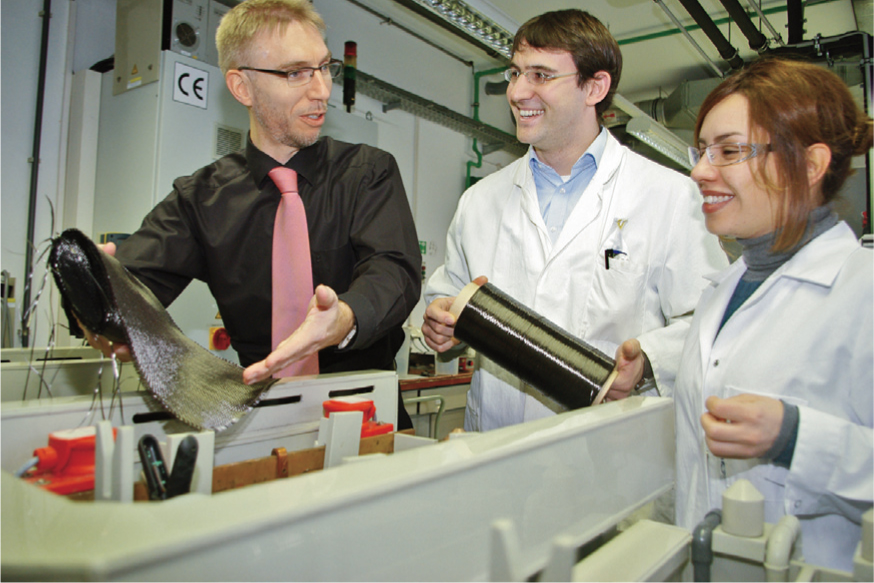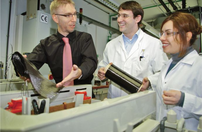 Die an der TU Chemnitz ansässige Nachwuchsforschergruppe TranS-Ver (Transfer neuartiger Smart Fiber-Verbunde in sächsische KMU) hat das Ziel, in eine neue Dimension von intelligenten und multifunktionalen Werkstoffen, sogenannten smart materials, vorzustoßen. Zehn junge Wissenschaftlerinnen und Wissenschaftler arbeiten interdisziplinär von der Entwicklung von Beschichtungskonzepten und -prozessen zur Funktionalisierung von Kohlenstofffasern (C-Fasern) bis hin zu deren Einbindung in Kunststoff. Es entsteht ein kohlenstofffaserverstärkter Kunststoff (CFK) für funktionale Leichtbauelemente.