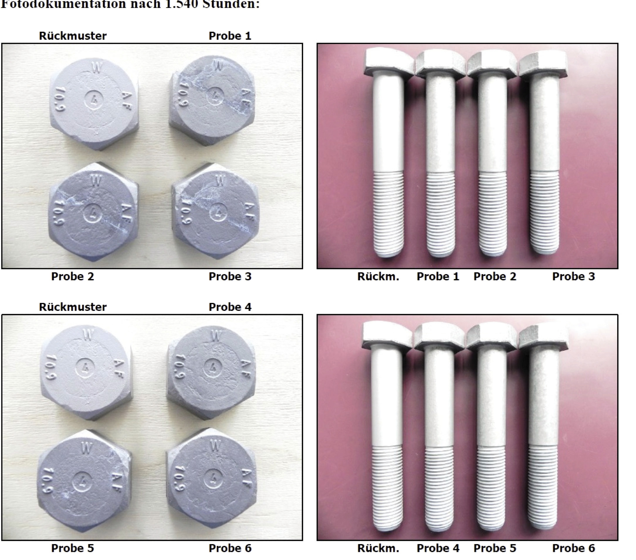 Die Zertifizierung des Delta-MKS-Beschichtungssystems durch den Germanischen Lloyd erfolgte nach Vorlage der geforderten Messergebnisse, die das Institut für Lackprüfung Andreas Keiner GmbH, Wettenberg, und die Schatz AG, Remscheid, auf der Grundlage entsprechender Akkreditierungen ermittelten. So wurde die durchschnittliche Schichtdicke des Gesamtaufbaus mit verschiedenen Messmethoden auf etwa 20 µm getestet. Die Korrosionsstandzeiten der Testbolzen wurden auf ein Minimum von 1500 Stunden im Salzsprühtest gemäß DIN EN ISO 9227 geprüft. Auch die Reibungszahl wurde an einem Referenzteil aus der Serienbeschichtung unter verschiedenen Bedingungen getestet. Das System aus Base- und Topcoat mit Gleitmittelzusatz wies dabei konstante Gesamtreibungszahlen µges den Anforderungen entsprechend zwischen 0,08 und 0,14 auf.