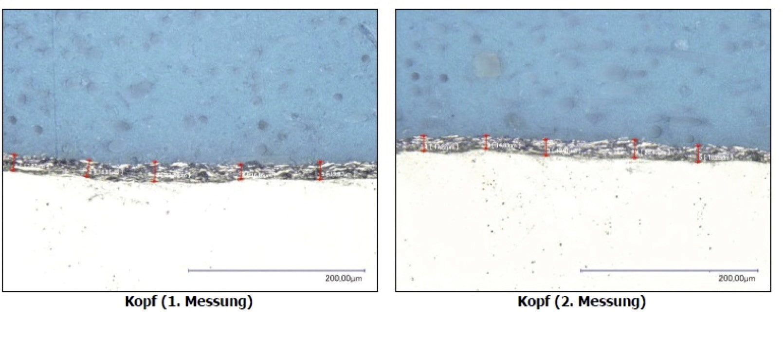 Abb. 4: Die Schliffbilder zeigen die Schichtdicke im Bereich des Kopfes. Die Werte liegen zwischen 17,8 µm und 19,9 µmFotos: Institut für Lackprüfung Andreas Klein GmbH