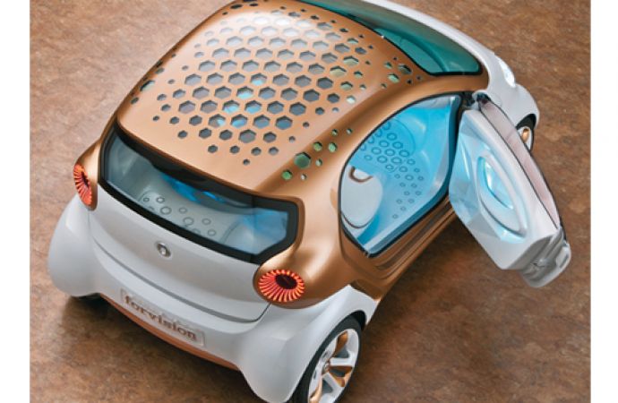 Eine weitere Anwendung wird die Verbauung eines Multifunktionsdaches sein. Hier werden in das Fahrzeugdach eingebaute Photovoltaikzellen einen Teil der notwendigen elektrischen Energie liefern. Weiterhin integrierte organische LEDs sorgen für die notwendige Beleuchtung. Basiskunststoffe, Solarzelle und OLED sind dabei transparent, so dass zusätzlich ein Glasdacheffekt erreicht wird. Die Ansätze werden bereits in einem Konzeptfahrzeug der BASF (Abb. 1) auf eine praktische Nutzung getestet [3].