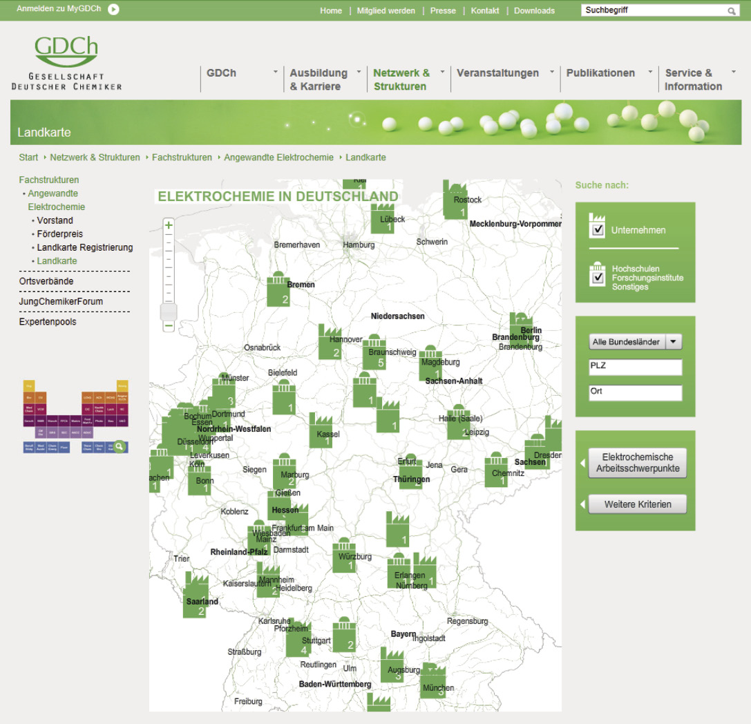 Um dieses Ziel zu erreichen, werden verschiedene Werkzeuge zur Verfügung gestellt. Eine wichtige Information ist die über die handelnden Institutionen. Jetzt steht auch eine Landkarte Elektrochemie (Abb. 4) zur Verfügung, die von der Fachgruppe Elektrochemie in Zusammenarbeit mit den Fachverbänden entwickelt worden ist. Um eine gute Übersicht über die Aktivitäten zu erhalten, sind alle Einrichtungen, die auf dem Gebiet der Elektrochemie aktiv sind, eingeladen, sich in die Karte einzutragen.
