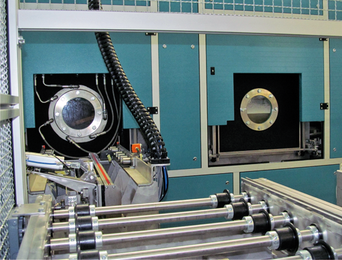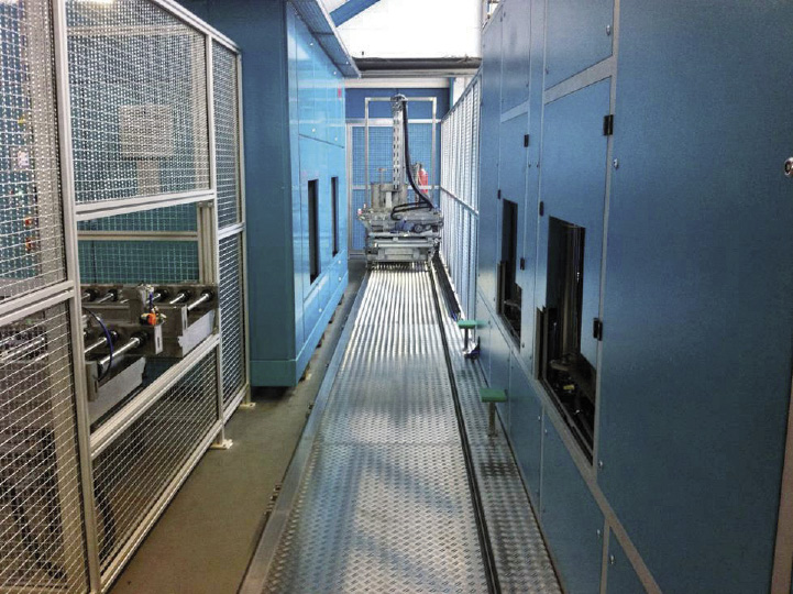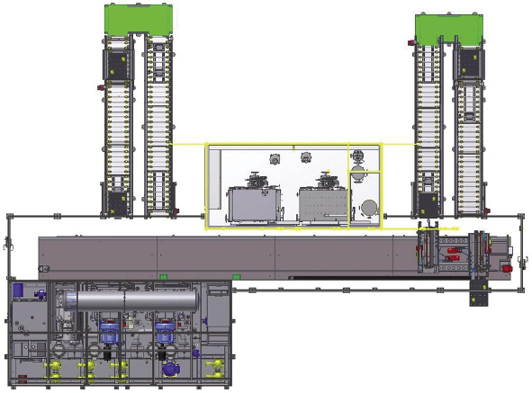 Innenaufnahme der Anlage mit dem Shuttlesystem (Mitte), der Reinigungsanlage (rechts) und der Beölungsanlage (links)
