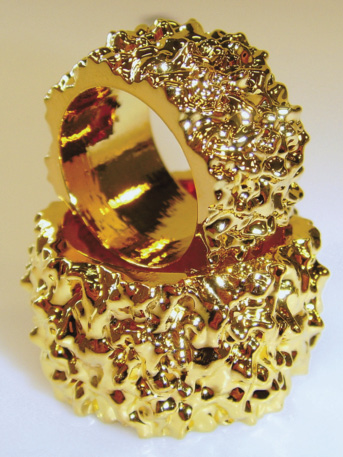Gold kann dabei als reines 24-Karat-Gold aufgebracht werden. Es sind aber auch Zusätze von Kobalt, Silber, Nickel oder Kupfer möglich. Dadurch lässt sich die Farbe der Schicht verändern. Auch die Härte und der Widerstand gegenüber Verschleiß verbessern sich durch die Zugabe von speziellen Legierungselementen in die galvanisch abgeschiedene Schicht. Als Beispiel für eine galvanisch aufgebrachte Goldschicht dient auch hier ein Modeschmuckring gefertigt in einem SLA-Prozess (Abb. 8).