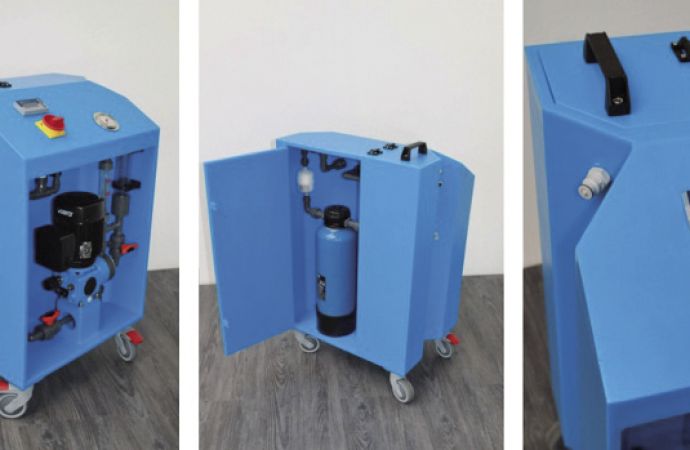 Bei der Produktplanung wurden technische, wirtschaftliche und ökologische Aspekte berücksichtigt, welche der Wartungs- und Reparaturmöglichkeiten der Deionisiereinheit dienen. Die Auslegung der Hochleistungsdeionisiereinheit GW-RD5 erfolgte nach der VDI-Richtlinie 2221. Dabei sind die verbauten Komponenten, wie Pumpen-, Filter- und Ionentauschereinheit exakt aufeinander abgestimmt. Dies erfolgte durch den Aufbau von Versuchsständen, bei denen Durchströmungstests für geeignete Formen der Deionisierharzbehälter und Filterkomponenten durchgeführt sowie die hydraulischen Belastungen der Pumpentechnik überprüft worden sind. Analytische und experimentelle Untersuchungen beschleunigten die konstruktive Auslegung der Deionisiereinheit GW-RD5 sowie die Fertigung eines Prototypen (Abb. 6).