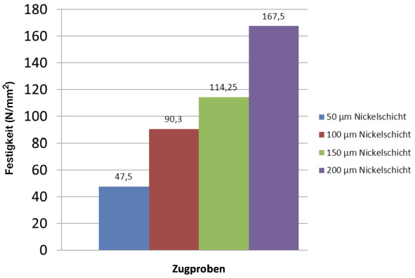 Metalle haben in der Regel deutlich höhere Zugfestigkeiten und können bei der Nutzung von hochfesten Legierungen bis weit über 1000 N/mm2 erreichen. Galvanisch abgeschiedene Nickelschichten ergeben je nach Abscheidebedingungen und physikalischen Parametern hohe Zugfestigkeiten. In einer Versuchsreihe wurden lasergesinterte Probekörper für Zugversuch mit einem Querschnitt von 10 mm x 4 mm mit einer Nickelhülle umgeben. Die Nickelhülle wurde in Dicken von 50 µm, 100 µm, 150 µm und 200 µm aufgebracht.
