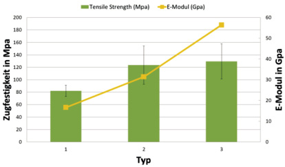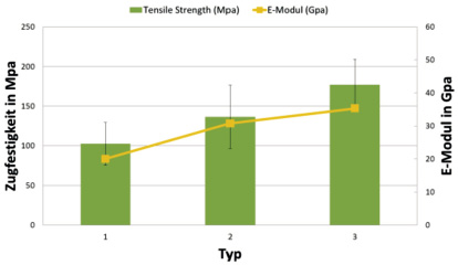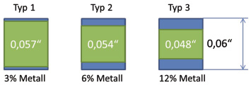 Dadurch entstanden drei verschiedene Typen (Typ 1 bis Typ 3) mit einem Metallanteil von 3 %, 6 % und 12 %, bezogen auf das Volumen (Abb. 15). Von jedem Typ wurden insgesamt fünf einzelne Zugstäbe angefertigt. Die Versuchsreihe wurde insgesamt zwei Mal durchgeführt.