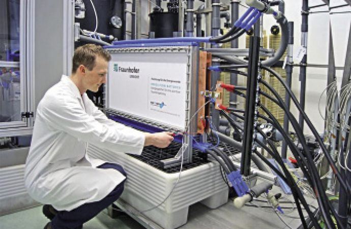Forscher des Fraunhofer-Instituts für Umwelt-, Sicherheits- und Energietechnik UMSICHT in Oberhausen konnten nun die Größe der Stacks und damit die Leistungsfähigkeit deutlich erhöhen. Dank eines neuen Designs ist es ihnen gelungen, Stacks mit 0,5 m2 Zellgröße zu fertigen. Das ist achtmal größer als die bisherigen Systeme und entspricht einer Leistung von 25 kW. Der Prototyp verfügt über einen Wirkungsgrad von bis zu 80 %. Er kann mit Strömen von bis zu 500 Ampere belastet werden.