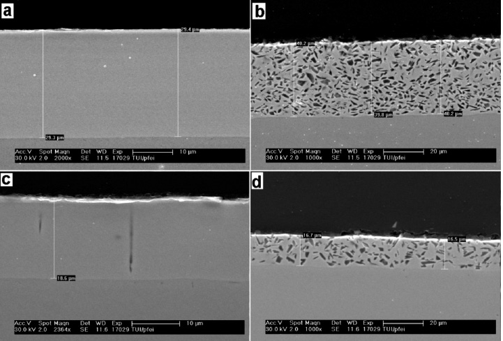 Table 2 compares the thicknesses obtained by the magnetic induction method and SEM, respectively. The values obtained via the magnetic induction method represent average values; on the other hand, the values taken from SEM represent the thickness in a specific zone. The data imply that all the deposits have uniform thicknesses.