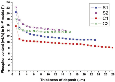 Since microstructure, corrosion behavior and other properties are depending on the phosphorous content in Ni-P deposits [1], a detailed description of the phosphorous content across the thickness of the deposits can be seen in Figure 4. In this case, for the evaluation of the phosphorous content of the Ni-P alloy (or Ni-P alloy matrix in the case of C1 and C2), only Ni and P were considered (without regarding the particles in the case of composite deposits).