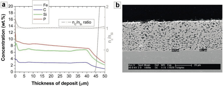 All deposits showed an amorphous micro-structure and high phosphorous content. Depth profile analysis of deposits by GD-OES demonstrated that the phosphorous content of deposits is not uniform across their thickness. At the surface, the phosphorus contents were higher than in the bulk. This fact implies a phosphorous enrichment at the surface of the deposits.