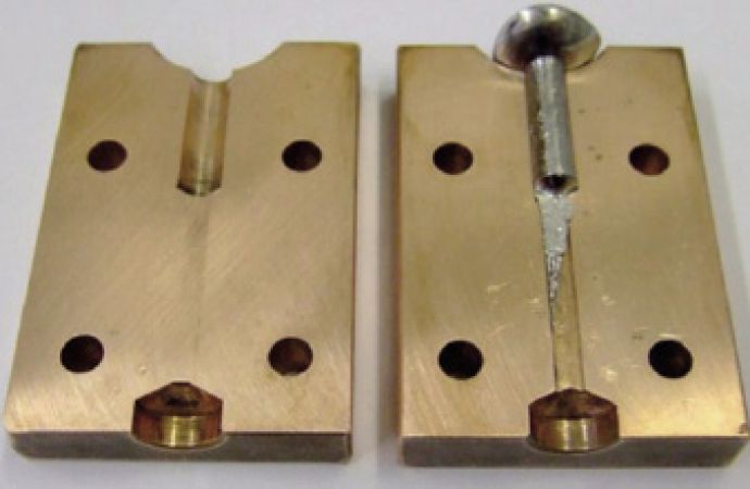 Nach der Homogenisierung der Proben durch mehrfaches Wenden und Umschmelzen erfolgt die geometrisch bestimmte Formgebung mittels Sauggießen (Abb. 1b). Diese ist mit allen untersuchten Legierungen unabhängig von der Zusammensetzung problemlos möglich. Die entstehenden Probenkörper (Ø 5,5 mm) werden mit einem metallographischen Präzisionstrenngerät in Zylinder mit einem Aspektverhältnis von eins getrennt und deren Stirnflächen planparallel geschliffen, um sie als Druckproben zu verwenden. Für die mechanische Charakterisierung werden Untersuchungen an den Legierungen (Tab. 1) jeweils im abgeschreckten und entsprechend den Literaturangaben ausgelagerten (500 °C, 3 h) Zustand durchgeführt. Auf die Lösungsglühung kann aufgrund der hohen Abkühlrate beim Erschmelzungsprozess und der geringen Probenabmessung verzichtet werden. Der quasistatische Druckversuch wird mit einer Dehnrate von 10-3 s-1 bis zu einer Stauchung von 40 % bis 50 % durchgeführt. Ein weiterer Teil der Proben wird leitfähig eingebettet und zur licht- und rasterelektronenmikroskopischen Untersuchung vorbereitet. Auch die Bestimmung der Vickershärte HV 10 erfolgt am Querschliff.