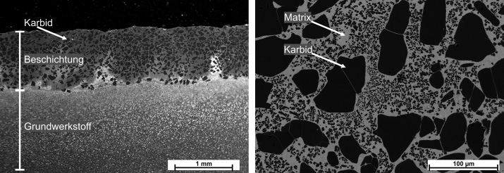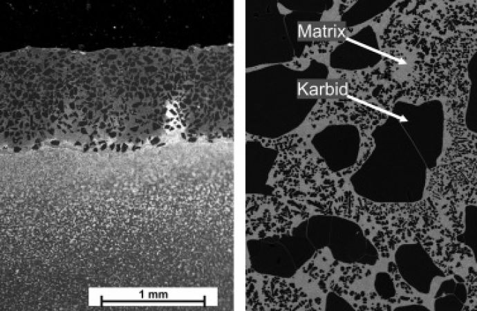 Einen für den Verschleißschutz typischen Schichtaufbau zeigt Abbildung 2 (Titelbild). Der Schichtaufbau, bestehend aus Titankarbiden in einem Matrixwerkstoff, ist erkennbar. Als Matrixwerkstoff ist hier eine Nickelbasislegierung gewählt. Die Karbide liegen darin zum einen als große Körner wie im ursprünglichen Zustand vor, sowie nach Aufschmelzen und Zerfallen fein verteilt in der Matrix. Eine wichtige Eigenschaft ist die gleichmäßige Karbidverteilung innerhalb der Beschichtung.