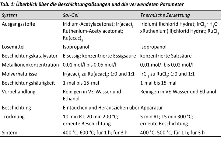Die ausgewählten Ausgangsstoffe, die Iridium- und Rutheniumchloride, wurden in dem gewünschten Konzentrations- und Mischungsverhältnis in einer Isopropanol-Salzsäure-Lösung gelöst. Die Proben wurden gereinigt, getaucht und herausgezogen. Nach 5 min an Raumtemperatur wurden sie für weitere 15 min bei 300 °C getrocknet. Nach einer kurzen Abkühlphase erfolgte eine erneute Beschichtung und nach dem letzten Beschichtungs-Trocknungs-Zyklus die Kalzinierung. Dies wurde bei verschiedenen Temperaturen und Zeiten durchgeführt. Tabelle 1 gibt einen Überblick über die Parameter der Beschichtung beider Verfahren.