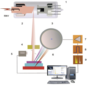 Abb. 1: Prinzip einer RFA-Schichtdickenmessung mit Röntgenröhre (1), Primärstrahl (2), Proportionalzählrohr (3), Blende (4), Videosystem (5), Sekundärstrahlung (6), Signalverstärker (7), Analog-Digital-Wandler (8) und Messwertauswertung (9)