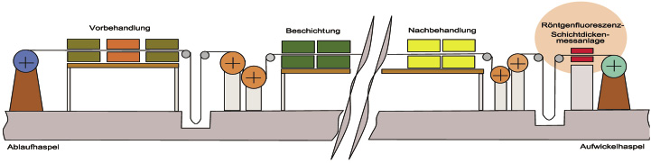 Der Produktionsprozess einer Bandbeschichtung beginnt mit dem Ablaufhaspel und endet mit dem Aufwickelhaspel. Dazwischen befinden sich neben der Beschichtung, zum Beispiel in Form der elektrolytischen Abscheidung, noch eine Reihe weiterer Arbeitsprozesse. Ein Teil einer Durchzugsanlage, wie er in Abbildung 2 schematisch dargestellt ist, wird mit einem Röntgenfluoreszenz-Schichtdickenanalysa-