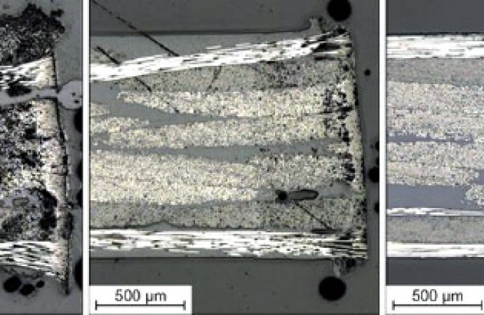 Text zum Titelbild: Lichtmikroskopisch analysierte Querschliffe lasergetrennter CFK-Werkstoffe mit PPS-Matrix. cw-Konturschneiden (links), cw-Quasisimultanschneiden (Mitte), Quasisimultanschneiden mittels im Nanosekundenbereich gepulster Laserstrahlung (rechts)