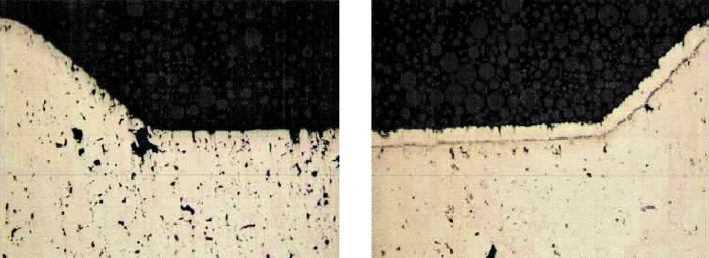 Abb. 2: Schliffbild von Sinterteilen vor (links) und nach (rechts) der Versiegelung der Poren durch die Zink-Thermo-DiffusionQuelle Greenkote