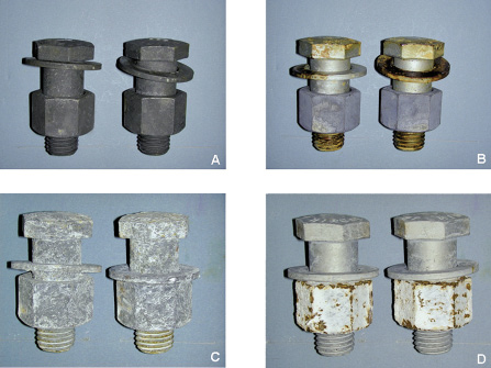 Abb. 4: Bauteile nach Tests in Schwefeldioxidatmosphäre und nach Salzsprühtests: A – ZTD-Bauteil nach SO2-Atmosphäre (4 Zyklen), B – Bauteil mit Zinklamellenüberzug nach SO2-Atmosphäre, C – ZTD-Bauteil nach 1200 h Salzsprühtest, D – Bauteil mit Zinklamellenüberzug nach 1200 h SalzsprühtestQuelle: Greenkote