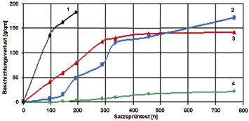 Abb. 5: Materialverlust durch Korrosion: 1 = Feuerverzinken, 2 = Sheradisieren mit Passivierung, 3 = Feuerverzinken mit zusätzlichen Aluminium, 4 = Zink-Thermo-Diffusion