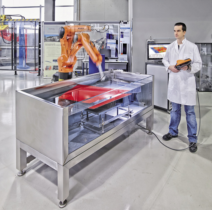 Abb. 2: 3D-Ultraschall-Tomographie: Ein mit dem Ultraschallprüfsystem verbundener Industrieroboter tastet das Bauteil ab / Bild: Uwe Bellhäuser