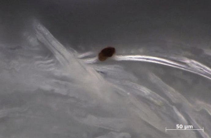Abb. 2: Mikroskopische Aufnahme eines Kupferpigments, welches mit Hilfe eines Binders an der Faseroberfläche haftet