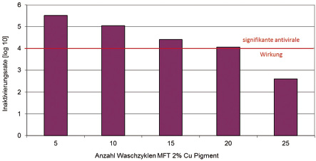 In weiteren Waschversuchen, angelehnt an die DIN EN ISO 105 C12 für industrielle Wäsche – bei der neben dem Einsatz herkömmlicher Waschsubstanzen zusätzlich eine mechanische Beanspruchung der Mikrofasertücher simuliert wird – zeigten die Muster selbst nach 20 Waschzyklen noch eine signifikante antivirale Wirkung [6]. Erst nach 25 Waschzyklen unterschritt die antivirale Wirkung die Signifikanzgrenze (Abb. 4).