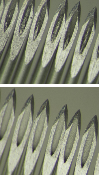 Das Verfahren kommt in der Medizintechnik beispielsweise für die gleichzeitige Reinigung und Entgratung von Kanülen, Zahnimplantatsockeln und chirurgischen Sägen zum Einsatz. Wobei sich Grate bis in den Mikrometerbereich zuverlässig und prozesssicher entfernen lassen. Die Entgratwirkung basiert einerseits auf dem mechanischen Effekt, der durch das direkte Auftreffen der Schneekristalle ausgelöst wird. Andererseits entsteht an der zu entgratenden Stelle eine turbulente Strömung, die den Grat einer Biege-Wechselbelastung aussetzt, unter der er abbricht.