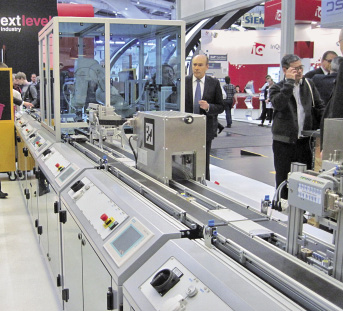 Schließlich werden sich durch neue Kommunikationsmöglichkeiten der Anlagenkomponenten die Freiheiten der räumlichen Anordnung und die Flexibilität für Umbauten enorm vergrößern. Auf der Hannover Messe 2014 zeigten verschiedene Aussteller modulare Fertigungslinien, die physisch umgestellt werden können und sich danach selbstständig soweit verständigen, dass ein Werkstück, das auf das verbindende Transportsystem aufgegeben wird, in jedem Fall die richtige Reihenfolge der Arbeitsstationen einhält, auch wenn dafür der Transportweg durchaus umständlich sein kann (Abb. 1).