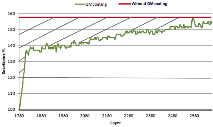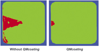 Text zum Titelbild: Ohne QMcoating kann es zu unzureichender Beschichtung des Layer kommen (die roten Bereiche weisen auf fehlendes Pulvermaterial hin); Ansatz dazu: Mit QMcoating wird der Dosierfaktor des Pulvers innerhalb der Toleranz angepasst