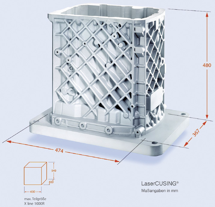 Größtes, generativ gefertigtes Bauteil: Ein Getriebegehäuse aus Aluminium (Maße: x: 474 mm; y: 367 mm; z: 480 m – exklusive Bauplattenhöhe) entsteht mit Aufbauraten von > 50 cm³/h aus PulverBild: Concept Laser GmbH