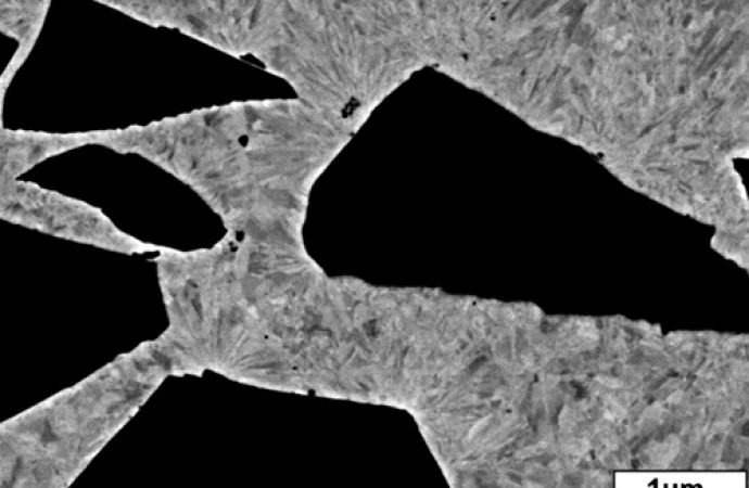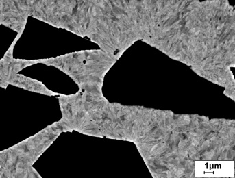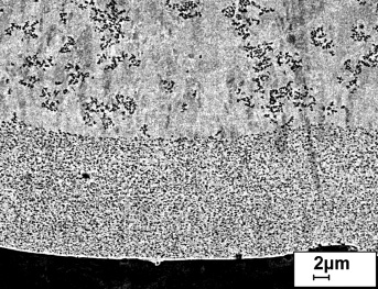 Die Gefügecharakterisierung erfolgte an materialografischen Querschliffen mit OP-S-Endpolitur im Rasterelektronenmikroskop (Zeiss LEO 1544VP und NEON 40EsB), kombiniert mit Röntgenspektrometrie (EDAX) und Rückstreuelektronenbeugung (EDAX TSL OIM 5.2). Für Untersuchungen im Transmissionselektronenmikroskop (Hitachi H8110) wurden mechanisch vorpräparierte Proben mittels 3-kV-Ar-Ionen transparent gedünnt (Gatan PIPS). Instrumentierte Mikrohärtemessungen mit Vickers-Diamant (HM2000 XYm, Helmut Fischer GmbH) wurden zumeist bei Lasten bis 500 mN (Haltezeit von 30 s) durchgeführt. Im Schwingungsverschleißtribometer (SVT 40, Wazau) erfolgten bei 22 °C und 50 % rel. Luftfeuchte die Kugel-Ebene-Tests mit 5 N Prüfkraft, 20 Hz Schwingungsfrequenz, 1 mm Schwingungsweite und einer Prüfzyklenzahl von 36 000 in Anlehnung an DIN 50324.