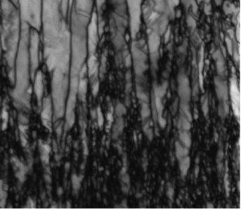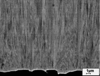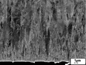 Die Nickelmatrix der Dispersionsschichten besteht typischerweise aus einer feinkristallinen Initialschicht auf dem Substrat, aus der konkurrierende stängelförmige Kristalle zunehmender Größe und Fasertextur wachsen, gut bekannt von galvanisch abgeschiedenen Nickelschichten (Abb. 1a). Werden mikroskalige Teilchen in solche Schichten eingebaut, erfolgt die Bildung der Initialschicht um jedes Teilchen; das Stängelwachstum wird begrenzt (Abb. 1b). Beim Einbau von submikroskaligen Teilchen besteht in aller Regel die Herausforderung, die im Elektrolyten verstärkte Agglomerationsneigung aufzuheben. Dazu eignet sich die Einstrahlung von Ultraschall in den galvanischen Elektrolyten. Die so erzeugten Kavitationsbläschen lösen durch ihre Implosion die Agglomerate auf, beeinflussen aber auch das Transportverhalten der Spezies in der Lösung. Das führt zur Bildung feinerer Stängelkristalle in der Matrix (Abb. 1c).