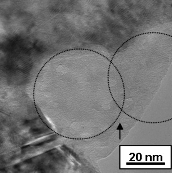Abb. 3: Details des Nanoteilcheneinbaus, gezeigt an kleinen Titanoxidagglomeraten (a, oben), guter Partikel-Matrix-Bindung (Partikel im Kreis, (b, Mitte) und der Grenzfläche zweier zusammengewachsener Alumiumoxidteilchen (Pfeil, c, unten)