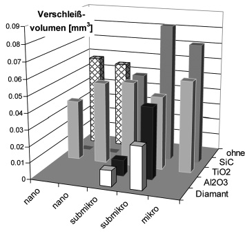 Abb. 4: Verschleißvolumen mikro- bis nanoskalig verstärkter Nickel- und Nickel-Kobalt-Schichten nach 36 000 Zyklen