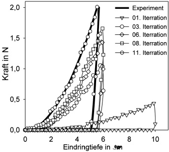 Für die numerische Simulation partikelverstärkter Nickelschichten ist es häufig ausreichend, ein relativ einfaches, eindimensionales Fließkurvenmodell nach Ludwik [12] (s = Cen) zu verwenden. Dafür müssen E-Modul E, Querkontraktionszahl µ, Werkstoffkonstante C und der Verfestigungsexponent n ermittelt werden. Wird Isotropie sowie ein athermisches Verhalten bezüglich der Dehnrate angenommen, ist es möglich, diese Modellparameter mit Hilfe der inversen Methodiken aus der Simulation einer Martenshärtemessung zu ermitteln. Dazu wird ein beliebiger Anfangsparametersatz P0 gewählt und die Simulation des realen Eindringversuchs vorgenommen. Anschließend werden charakteristische Größen (Kräfte, Eindringtiefen) aus der FEM-Simulation extrahiert, mit den experimentellen Werten verglichen und die Abbildungsgenauigkeit mathematisch beschrieben. In einer Iterationsschleife wird ein neuer Parametersatz Pn mit dem Ziel festgelegt, die Abweichungen zwischen Simulation und Experiment zu minimieren, bis die Abweichung F(Pn) ein Minimum (im Idealfall Null) erreicht. Der so gefundene Parametersatz Pn wird als optimale Lösung angesehen. Für eine Nickel-Titanoxid-Schicht (Ø 21 nm, 1 Vol.%) wurde dies exemplarisch durchgeführt.