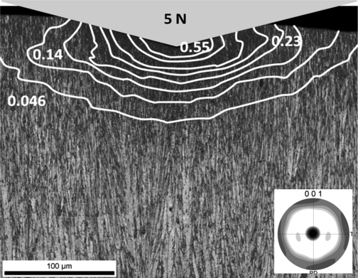 Ein Vergleich des gemessenen Kraft-Eindringtiefen-Verlaufs mit den Verläufen aus verschiedenen numerischen Iterationen (Abb. 5a) zeigt, dass nach elf Iterationen der experimentelle Verlauf sehr gut widergegeben wird. Die so identifizierten Parameter sind in Tabelle 2 zusammengefasst. Der Querschliff eines Vickers-Eindrucks (Normalkraft 5 N) in die Schicht wurde mittels Rückstreuelektronenbeugung untersucht (Abb. 5b). Die Bandkontrastkarte zeigt, dass erwartungsgemäß mit zunehmender plastischer Verformung durch die erzeugten Verzerrungen im Gefüge der Kontrast der Messung zu Grunde liegenden Beugungsbilder schlechter wird. Darüber ist eine Isoliniendarstellung der plastischen Dehnung/Stauchung aus der numerischen Simulation gelegt, welche zeigt, dass diese ab einem Wert von etwa 0,2 indirekt über die EBSD-Messung nachgewiesen werden kann. Dabei wurde die Größe der plastischen Zone unter dem Eindruck in Schichtdickenrichtung leicht unterschätzt. Dies ist unter anderem auf die in der numerischen Simulation vorausgesetzte Isotropie zurückzuführen. Die Schicht weist jedoch eine ausgeprägte <100>-Fasertextur in Wachstumsrichtung auf (Einsatz in Abb. 5b), die in der Simulation bisher nicht berücksichtigt wurde.