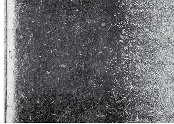Abb. 1: Nitrierte Randschicht im Schliff; der weiße Bereich ist die Verbindungsschicht und der dunkel angeätzte die Diffusionszone