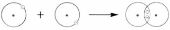 Symbolisch wird für das Wasserstoffmolekül eine Darstellung mit Punkten oder Strichen verwendet (H : H oder H–H in Abb. 40). Dabei symbolisieren die beiden Punkte die Elektronen, die an der Bindung beteiligt sind, wobei die 2 Punkte das gemeinsame Elektronenpaar darstellen. Gebräuchlicher ist die Schreibweise, in der ein Bindungsstrich für das gemeinsame Elektronenpaar verwendet wird. Die Elektronen werden jetzt dem Gesamtmolekül zugeordnet, das heißt jedes Wasserstoffatom ist an zwei Elektronen beteiligt und hat damit eine Elektronenkonfiguration, die derjenigen des Edelgases Helium entspricht.